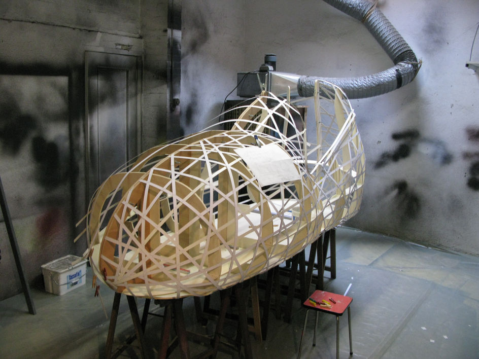 La Pantoufle, le titre du spectacle, écrit par Claude Ponti qui a également conçu la scénographie. La grande pantoufle servant d’habitat au comédien est confectionnée en matière moelleuse. Tanguant, pivotant et offrant maints portes et tiroirs à attrapes, elle symbolise un confortable utérus.